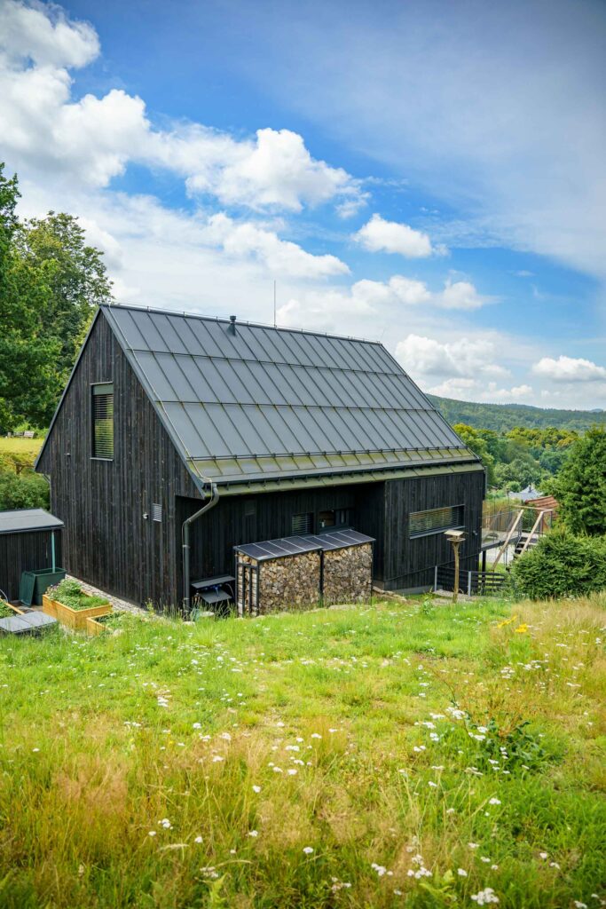 Na místě původní chaty vyrostla elegantní dřevostavba pro aktivní seniorský pár. Dům s tmavou opalovanou fasádou chytře využívá svažitý pozemek a nabízí dílnu, terasu s úchvatným výhledem na Ještěd i podkroví s dostatkem prostoru pro návštěvy. Elegantní detaily, terasa s pergolou, zahrada a okolní krajina dotváří velmi příjemnou atmosféru.